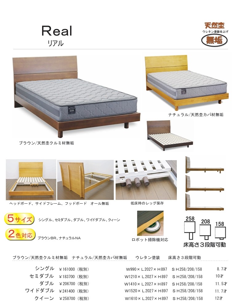 ヘッドボード、サイドフレーム、フッドボードオール無垢 床高さ3段階調節可動、低床時のレッグ保存機能付き、ロボット掃除機対応