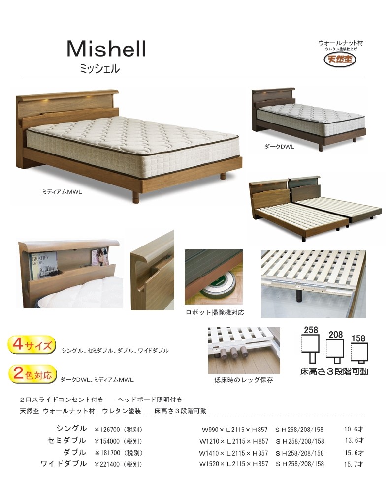ウォールナット材天然杢の質感が感じられるベッドフレーム 選べるカラー2色、選べる4サイズ
